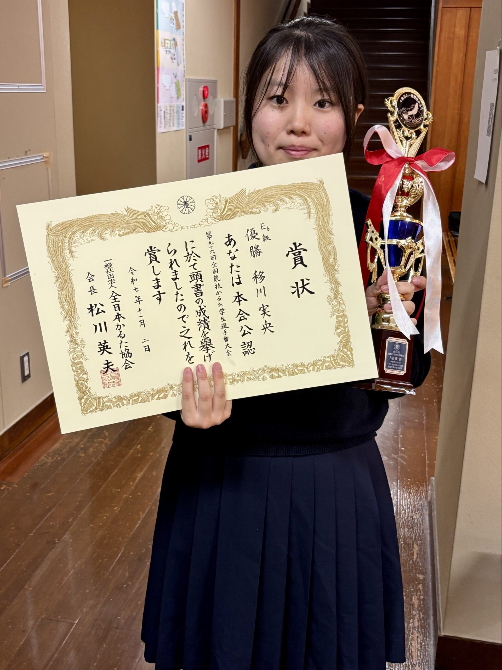 11月2日に開催された「第96回全国競技かるた学生選手権大会 E級の部」において、1年の移川実央さんが優勝しました!