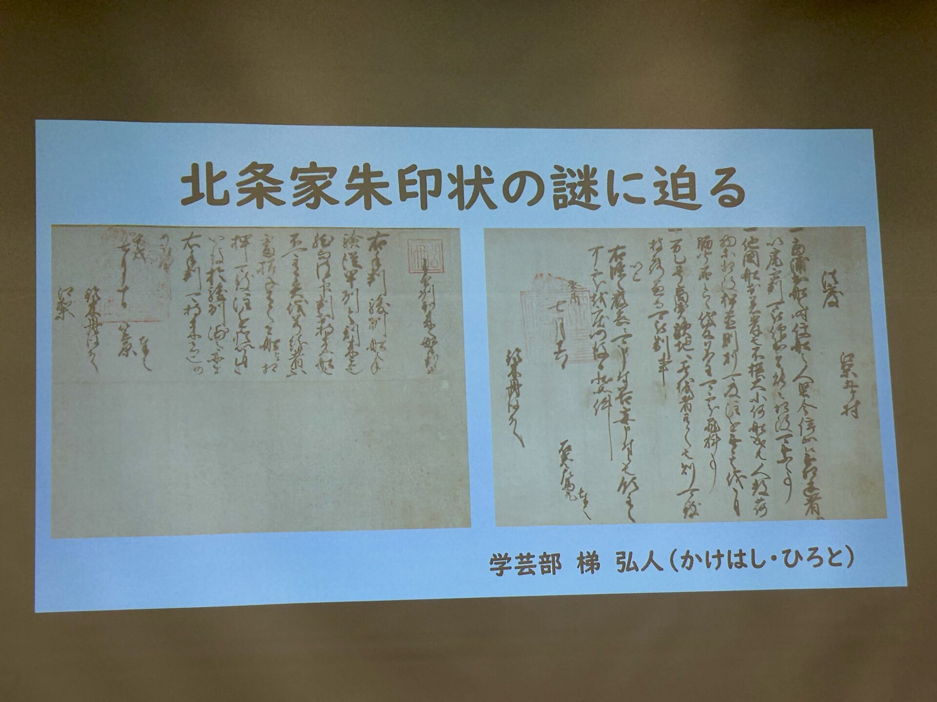 12月6日、かながわ労働プラザで実施された歴史学講演会に参加しました。講演テーマは「北条家朱印状の謎に迫る」、講師は神奈川県立歴史博物館学芸員梯弘人(かけはしひろと)先生。                     北条家朱印状の特徴にはじまり、その古文書学的知見、文書作成経緯の解明などの解説をしていただきました。終了後、部員の質問にも丁寧に回答していただきました。部員も、来年度の文化祭で予定している小田原の歴史研究に対するモチベーションがとてもあがったと話しています。