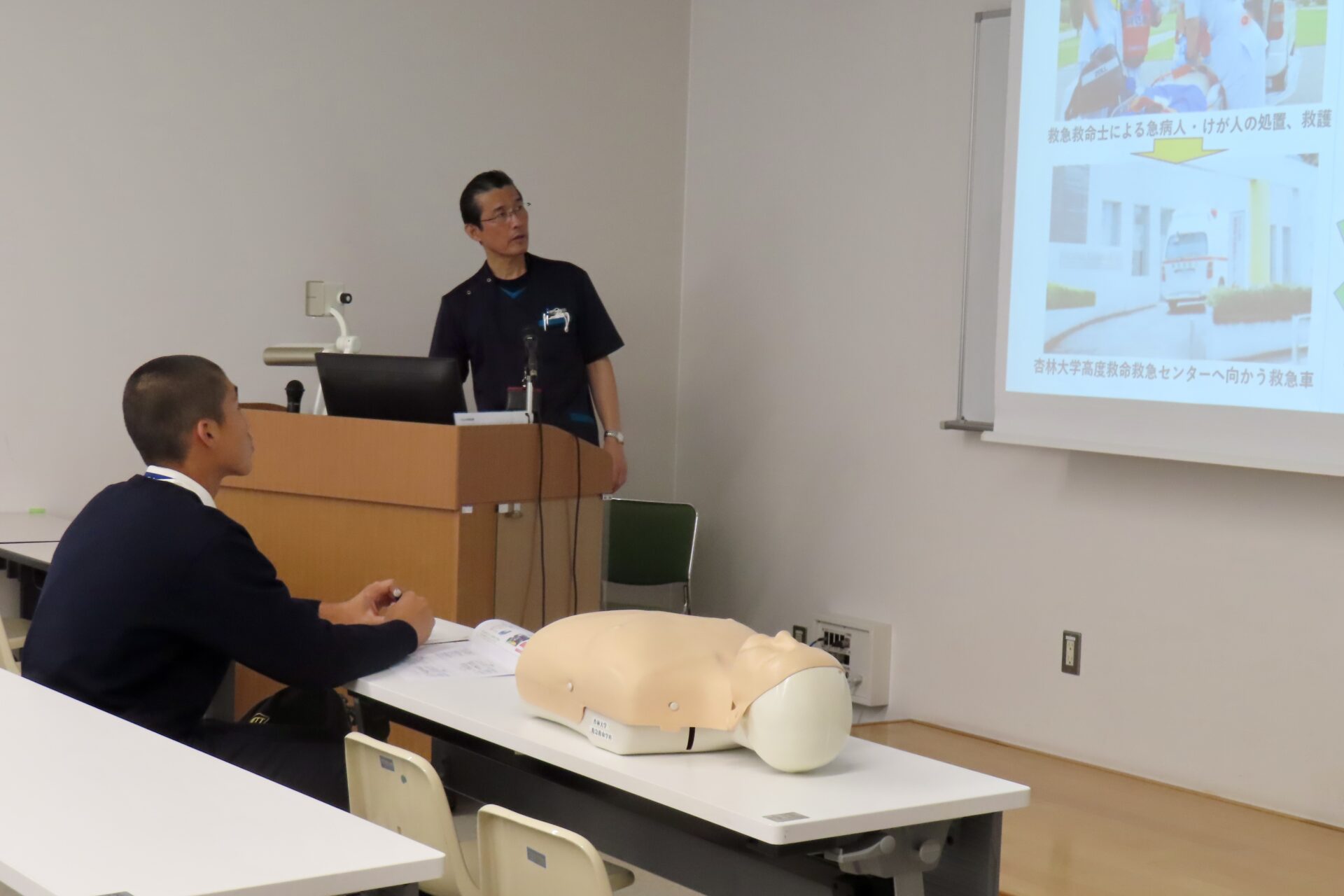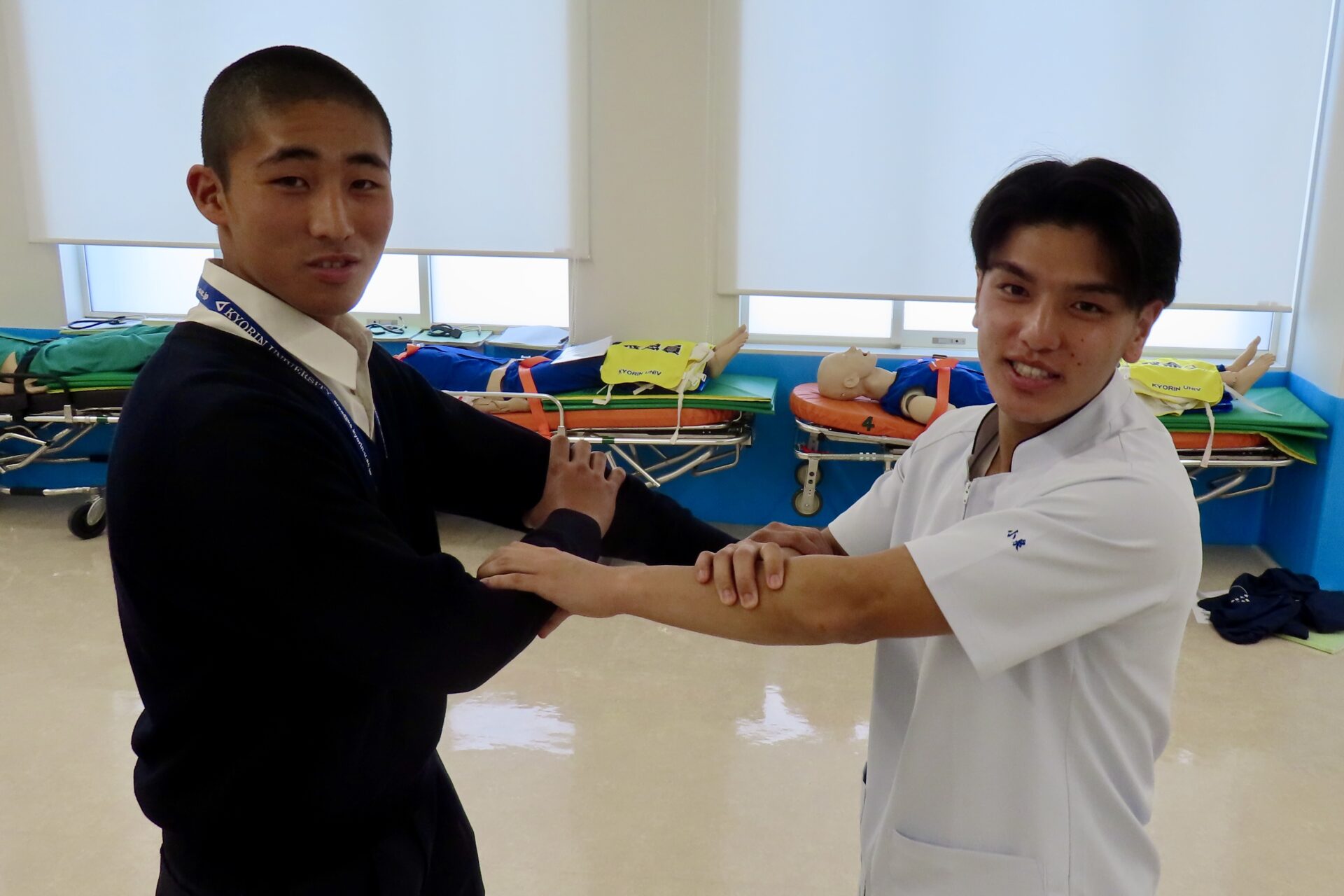 当日、キャンパスデー開始直後に本校の卒業生が声をかけてくれ、保健学部救命救急学科の授業まで案内してくれる場面もありました。この授業では担架搬送の実習に取り組む大学生のリアルを見て、大学の学びに対する印象も大きく変わりました。また、プログラム終了後にはたくさんの生徒が語学ラボに立ち寄り、楽しく実践的な英語を学ぶ時間を過ごしました。大学の学びやキャンパスライフに触れることで、生徒たちは進路選択や学びの意義について新たな視点を得たようです。