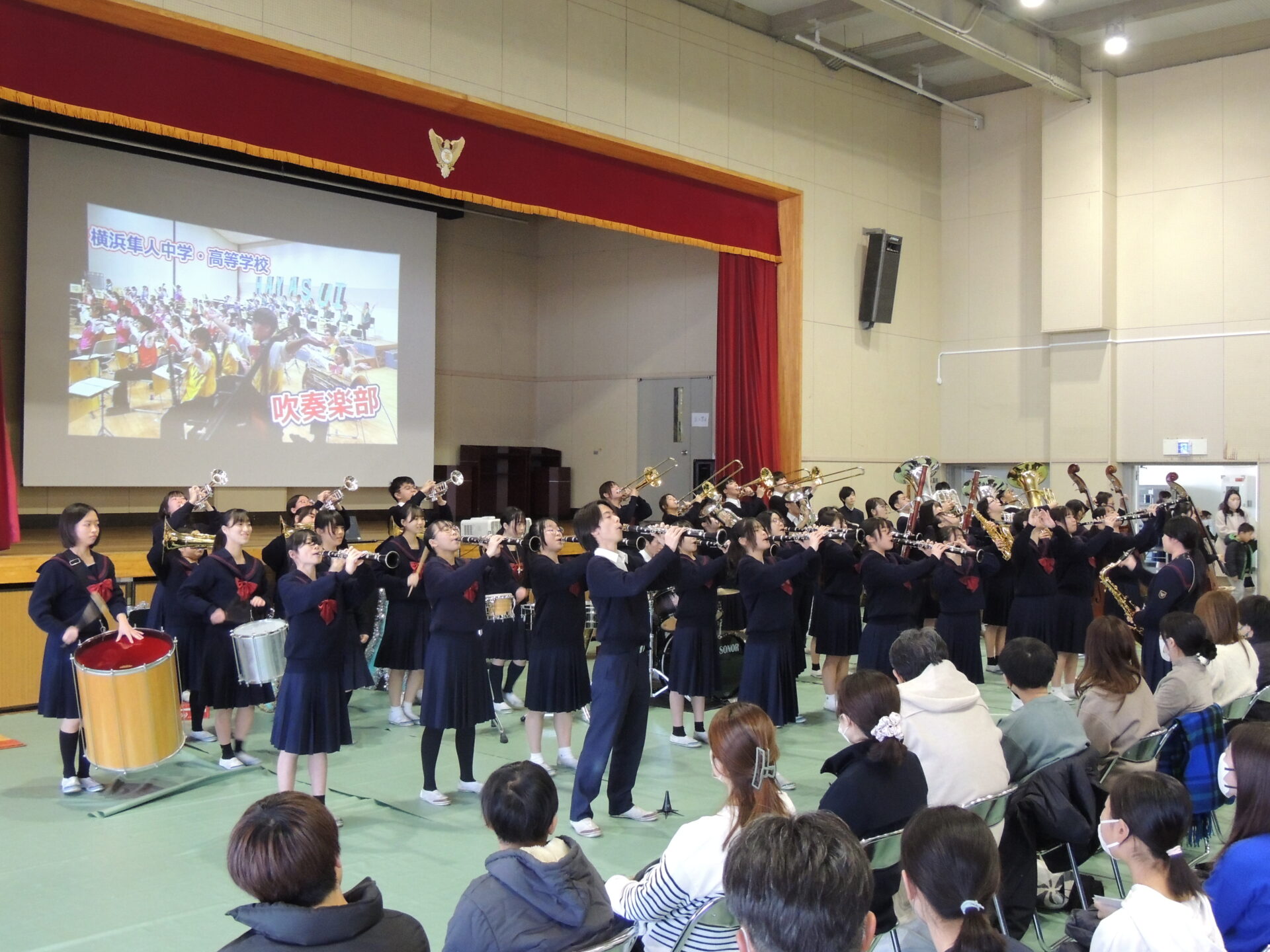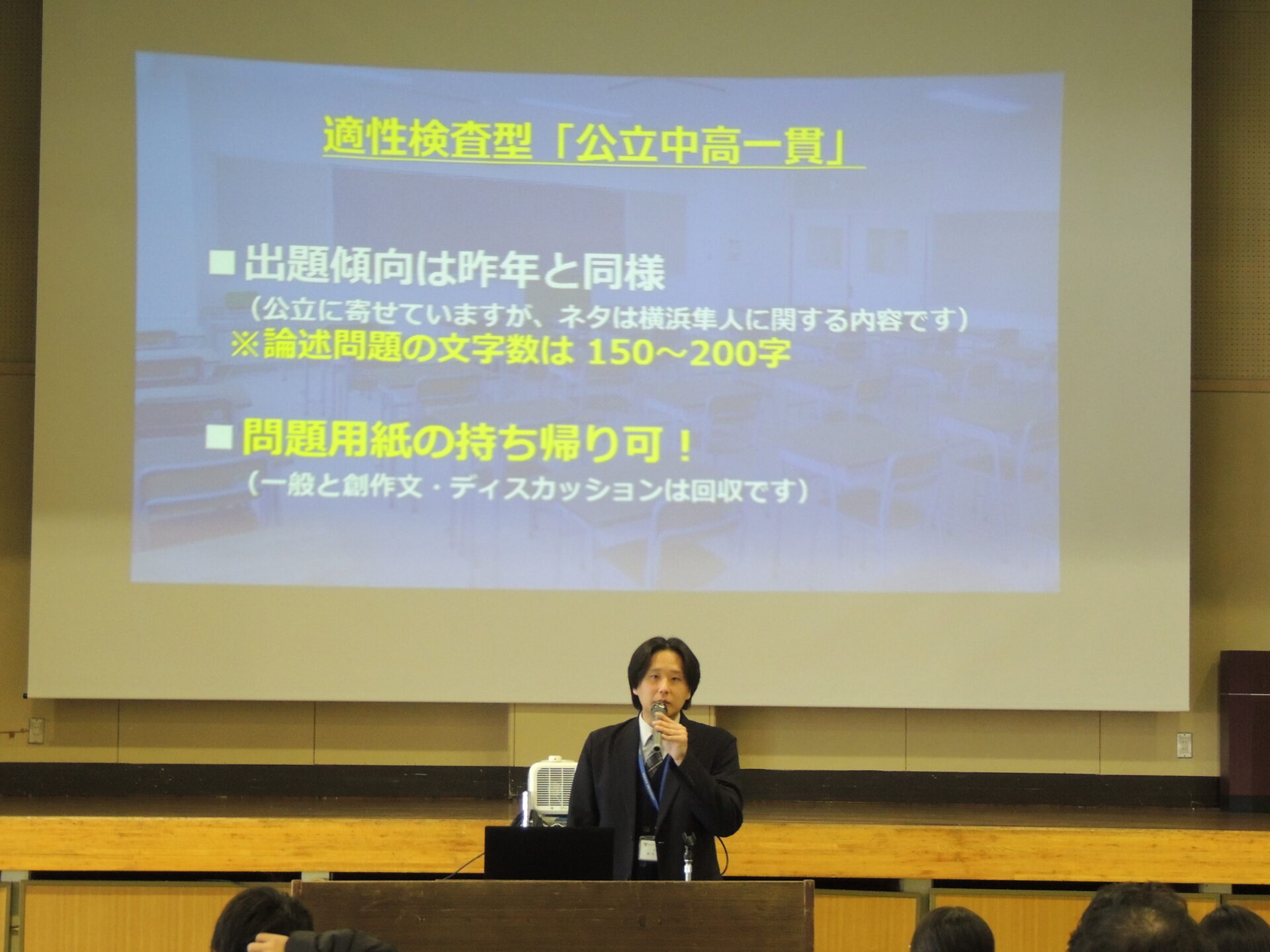 吹奏楽部による「エルクンバンチェロ」の演奏でスタートした説明会は、第1回の「出題傾向と解法の手引き」、第2回の「Q&A解説」のダイジェスト版に加えて、入試直前の最新情報など、今回しか聞けない内容も盛りだくさんでした!在校生インタビューでは、吹奏楽部の高校1年生と、硬式野球部の高校3年生が勉強や部活動はもちろん、横浜隼人の魅力などを話してくれました!